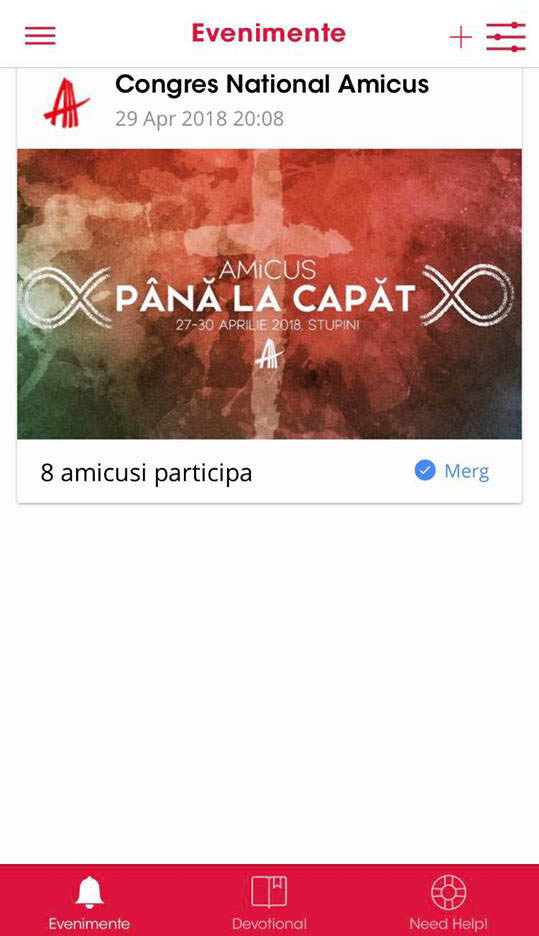 La aceasta rubrica utilizatorul (amicul) va putea sa acceseze cu usurinta tot ceea ce tine de intalnirile filialei. Tot odata, fiecare utilizator va avea posibilitatea sa posteze atat evenimente cat si diferite intalniri pentru restul studentilor (serate, iesiri in oras, plimbari pe role etc). Odata creat evenimentul el va fi revizuit si aprobat de un administrator. Dupa publicarea lui toti AMiCUSii vor primi o notificare cu aceste evenimente create! Din interiorul acestui meniu exista posbilitatea sa interactionezi cu evenimentul si sa dai feedback-ul tau prin apasarea butonului ”merg”.